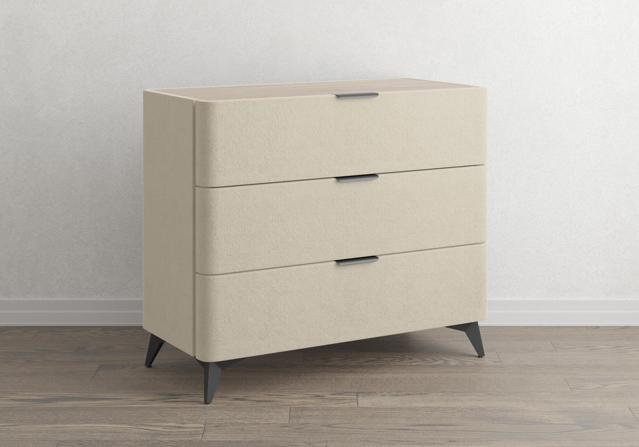 Sheldon - комод, который выделяется не за счёт громкой формы, а за счёт точных деталей. Мягкий корпус в сочетании со столешницей из ЛДСП "Дуб Сонома", изящные металлические ручки и высокие чёрные ножки - всё это работает вместе, создавая образ дорогой мебели. Три ящика на скрытых направляющих с доводчиками закрываются без хлопка и не выпадают при случайном толчке.